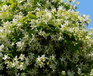 Le jasmin blanc d'hiver est une magnifique grimpante volubile, frileuse, à généreuse floraison printanière en bouquets de fleurs étoilées rose porcelaine, .